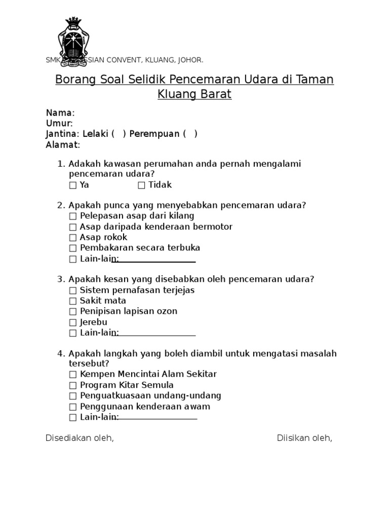 Related : Borang Soal Selidik Pencemaran Udara / Contoh rasmi borang soal selidik tugasan geografi pt3 2014..