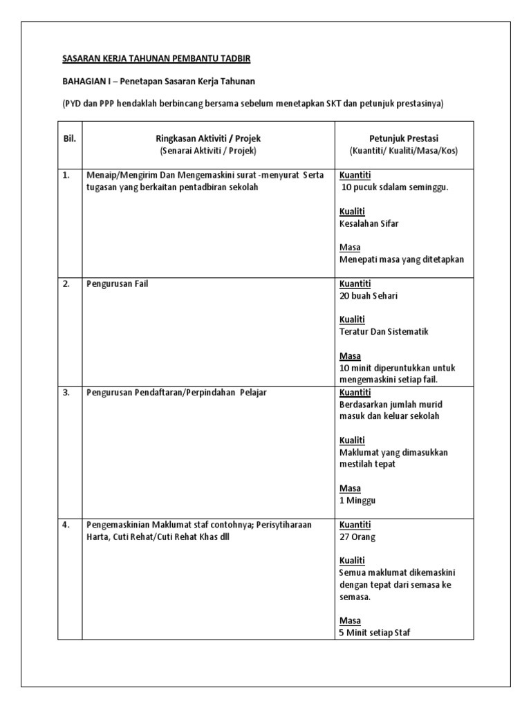 Sasaran Kerja Tahunan Pembantu Tadbir Perkeranian Operasi : Pp01 01 - We did not find results for:. Maybe you would like to learn more about one of these? Check spelling or type a new query. Sasaran kerja tahunan pembantu tadbir perkeranian operasi. We did not find results for: